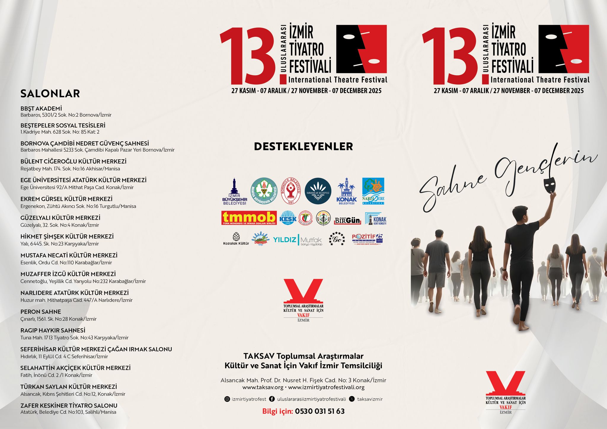 Türkiye'nin en köklü tiyatro etkinliklerinden biri olan Uluslararası İzmir Tiyatro Festivali, bu yıl 13. kez sahne almaya hazırlanıyor. Festivalin bu yılki teması “Sahne Gençlerin” olarak belirlendi ve genç yeteneklerin sergileneceği etkinlikler izleyicilerle buluşacak. Festival, 27 Kasım 2025 Perşembe günü başlayıp, 7 Aralık 2025 Pazar günü sona erecek. İzmir'in farklı ilçelerine yayılan program, şehrin kültür-sanat atmosferini zenginleştirecek.