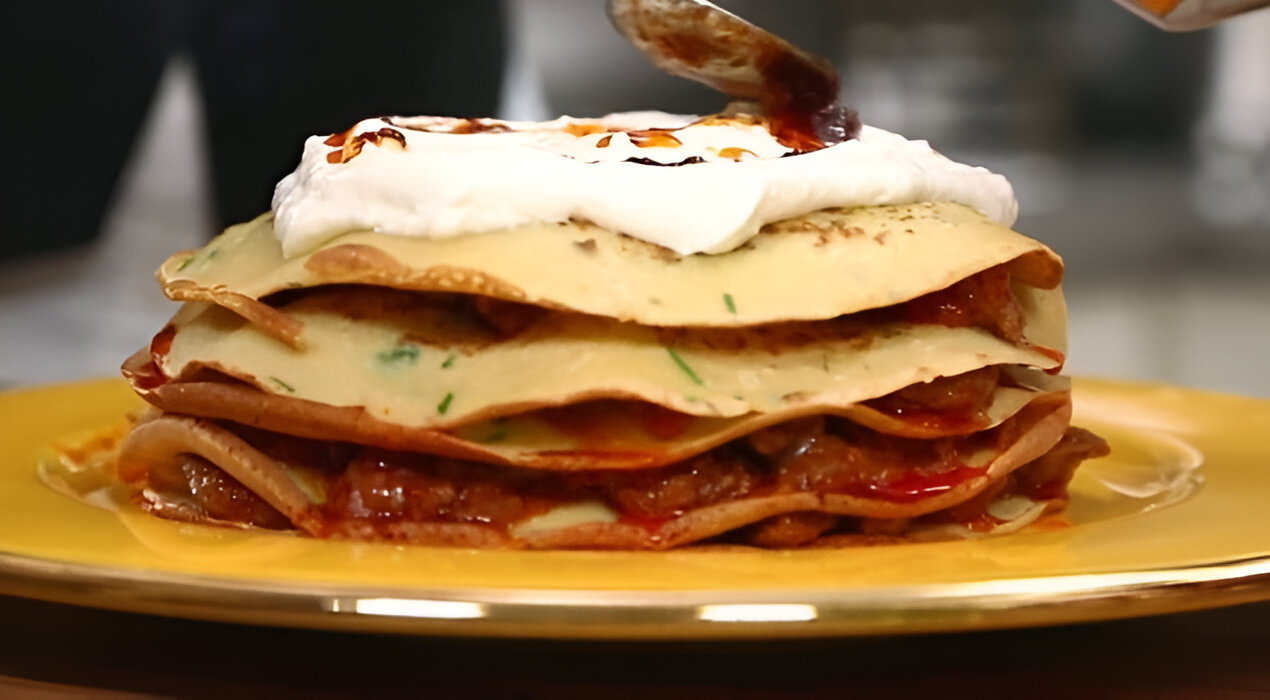Zeytinyağı bir tencerede ısıtılır, ardından jülyen doğranmış kuzu eti eklenerek kavrulur. Et suyunu çektikten sonra, küp doğranmış soğan eklenip pembeleşene kadar pişirilir. Daha sonra küp doğranmış domates ve salça eklenip karıştırılır. Su ve baharatlar ilave edildikten sonra etler yumuşayana dek pişirmeye devam edilir. Krepler için süt, yumurta, un ve maydanoz çırpılarak hamur hazırlanır. Isıtılmış tavada ince krepler pişirilir. Servis tabağında bir krep ve bir kat etli harç oluşturacak şekilde katlar yerleştirilir. Üzeri yoğurtla kaplanır ve tereyağında kızdırılan kırmızı biber, yoğurdun üzerine gezdirilerek servis edilir.