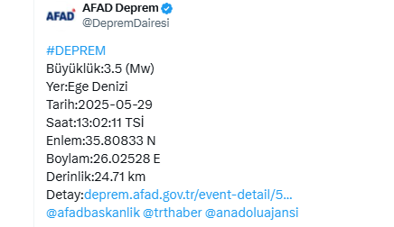 AFAD’ın sunduğu verilere göre, 29 Mayıs 2025 tarihinde saat 13:02:11 TSİ’de Ege Denizi’nde 3.5 büyüklüğünde bir deprem yaşandı. Depremin merkez üssü enlem 35.80833, boylam 26.02528 koordinatları üzerinde yer alıyor. Sarsıntının yerin 24.71 kilometre derinliğinde meydana geldiği ifade edildi.