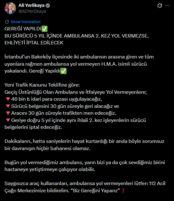 Ambulansların gecikmesinin can kayıplarına yol açabileceğine dikkat çeken Yerlikaya, sürücülerin geçiş üstünlüğü bulunan araçlara yol vermelerinin hayati önem taşıdığını vurguladı. Sosyal medya üzerinden yaptığı açıklamada şu ifadeleri kullandı: “Gereği yapıldı. Bu sürücü, 5 yıl içinde ambulansa 2. kez yol vermezse, ehliyeti iptal edilecek. İstanbul’un Bakırköy ilçesinde iki ambulansın arasına giren ve tüm uyarılara rağmen ambulansa yol vermeyen H.M.A. isimli sürücü yakalandı. Gereği Yapıldı. Yeni Trafik Kanunu Teklifine göre: Geçiş Üstünlüğü Olan Ambulans ve İtfaiyeye yol vermeyenlere; 46 bin ₺ idari para cezası uygulayacağız, sürücü belgesini 30 gün süreyle geri alacağız ve aracını 30 gün süreyle trafikten men edeceğiz. Geriye dönük 5 yıl içinde aynı ihlali 2. kez işleyenlerin sürücü belgelerini iptal edeceğiz. Dakikaların, hatta saniyelerin hayat kurtardığı bir anda böyle sorumsuz bir davranışın hiçbir mazereti olamaz. Bugün yol vermediğimiz ambulans, yarın bizi ya da çok sevdiğimiz birini hastaneye yetiştirmeye çalışıyor olabilir. Saygısızca araç kullananları, ambulansa yol vermeyenleri lütfen 112 Acil Çağrı Merkezimize bildirelim. ‘Biz gereğini yaparız.’