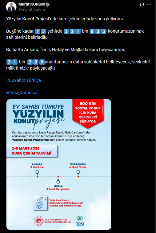 Çevre, Şehircilik ve İklim Değişikliği Bakanı Murat Kurum, 2-8 Mart haftasının kura takvimini sosyal medya üzerinden paylaşarak kura çekimlerinin sona yaklaştığını duyurdu. Yapılan açıklamaya göre şu ana dek 75 şehirde 331 bin 833 konutun hak sahipleri belirlenmiş durumda. Bu hafta Ankara, İzmir, Hatay ve Muğla şehirlerinde kura heyecanı yaşanacak ve 71 bin 799 konutun daha sahipleri belirlenecek.