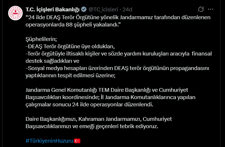 “24 ilde DEAŞ terör Örgütüne yönelik düzenlenen operasyonlarda 88 şüpheli yakalandı.” Jandarma Genel Komutanlığı Terörle Mücadele Daire Başkanlığı ve Cumhuriyet Başsavcılıkları koordinesinde, İl Jandarma Komutanlıklarınca DEAŞ Terör Örgütüne yönelik 24 ilde operasyonlar düzenlendi.