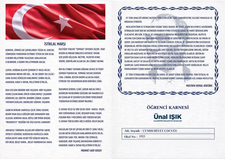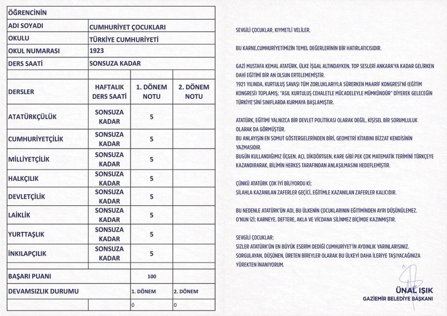 Bu gelişmelerin ardından Gaziemir Belediye Başkanı Ünal Işık, sosyal medya üzerinden dikkat çekici bir açıklamada bulundu. Gelişim Raporları'ndan Atatürk'ün kaldırıldığını eleştiren Işık, “Bu Yarıyıl Tatilinde Atatürk’lü karne almayan tüm çocuklar için bu karneleri bastırıp, Gaziemir sokaklarında gezip, tek tek çocuklarımıza dağıtacağım. Atatürk, bu ülkenin eğitiminin, Cumhuriyetinin ve geleceğinin teminatıdır. Hiçbir çocuğun karnesinden, hiçbir sınıftan, hiçbir gelecekten silinemez.” ifadelerini kullandı.