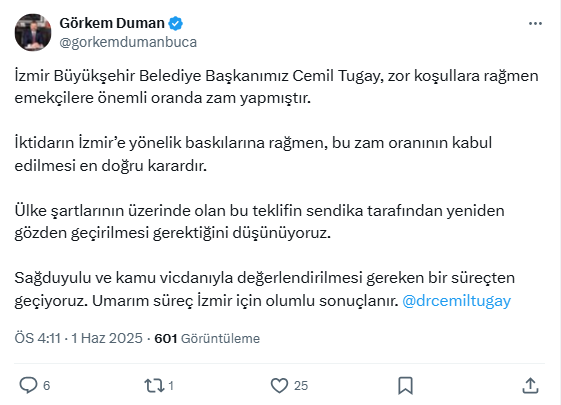 Buca Belediye Başkanı Görkem Duman, sosyal medya üzerinden destek mesajı paylaştı. Duman, “İzmir Büyükşehir Belediye Başkanımız Cemil Tugay, zor koşullara rağmen emekçilere önemli bir zam yapmıştır. İktidarın İzmir’e yönelik baskılarına rağmen, bu zam oranının kabul edilmesi en doğru karardır. Ülke koşullarının üzerinde olan bu teklifin sendika tarafından yeniden değerlendirilmesi gerektiğini düşünüyoruz. Sağduyulu ve kamu vicdanıyla ele alınması gereken bir süreçten geçiyoruz. Umarım süreç İzmir için olumlu sonuçlar doğurur.” dedi.
