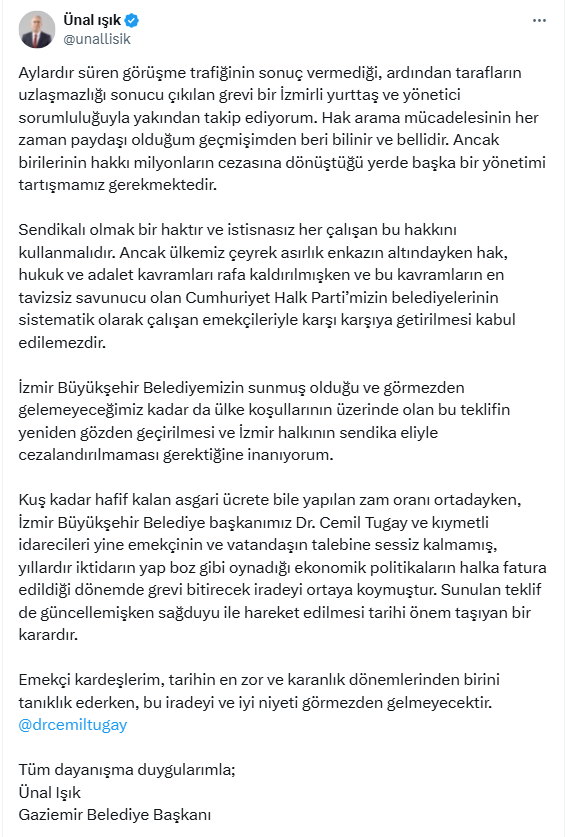 Ünal Işık, Cemil Tugay’a olan desteğini vurgularken, “Asgari ücrete bile yapılan zam oranı ortadayken, İzmir Büyükşehir Belediye Başkanımız Dr. Cemil Tugay ve değerli yöneticileri, emekçinin ve vatandaşın talebine sessiz kalmamış, yıllardır iktidarın oynadığı ekonomik politikaların halka yansıtıldığı dönemde grevi sona erdirecek iradeyi ortaya koymuştur. Sunulan teklifin güncellenmesi, sağduyulu hareket edilmesi gereken tarihi bir önem taşımaktadır. Emekçi kardeşlerim, tarihin en zor zamanlarından birine tanıklık ederken, bu iradeyi ve iyi niyeti göz ardı etmeyeceklerdir.” diyerek sözlerini tamamladı.