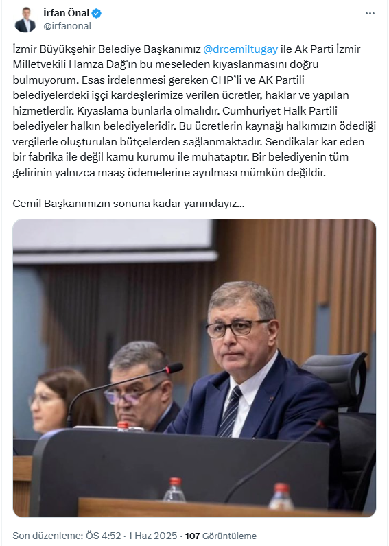 Bayraklı Belediye Başkanı İrfan Önal, sosyal medya hesabından Tugay’a destek mesajı gönderdi. Önal, “İzmir Büyükşehir Belediye Başkanımız Cemil Tugay ile AK Parti İzmir Milletvekili Hamza Dağ’ın bu meselede kıyaslanmasını doğru bulmuyorum. Esas olarak incelenmesi gereken CHP’li ve AK Partili belediyelerdeki işçi kardeşlerimize sunulan ücretler, haklar ve gerçekleştirilen hizmetlerdir. Kıyaslama bunlarla olmalıdır. Cumhuriyet Halk Partili belediyeler halkın belediyeleridir. Bu ücretlerin kaynağı, halk tarafından ödenen vergilerle oluşturulan bütçelerden sağlanmaktadır. Sendikalar, kar eden bir fabrika ile değil, kamu kurumu ile muhatap olmaktadır. Bir belediyenin tüm gelirinin yalnızca maaş ödemelerine ayrılması mümkün değildir. Cemil Başkanımızın yanında sonuna kadar duracağız.” ifadelerini kullandı.