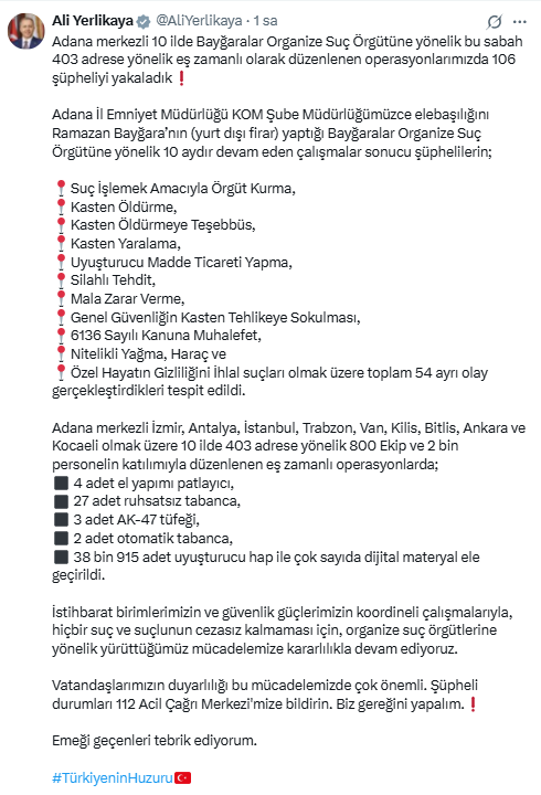 İçişleri Bakanı Ali Yerlikaya, sosyal medya hesabı üzerinden yaptığı açıklamada, Adana merkezli 10 ilde düzenlenen eş zamanlı operasyonlarla Bayğaralar organize suç örgütüne yönelik önemli bir adım atıldığını duyurdu. Operasyonlarda, aralarında İzmir'in de bulunduğu illerde toplam 403 adrese baskın yapıldı ve 106 şüpheli yakalandı.