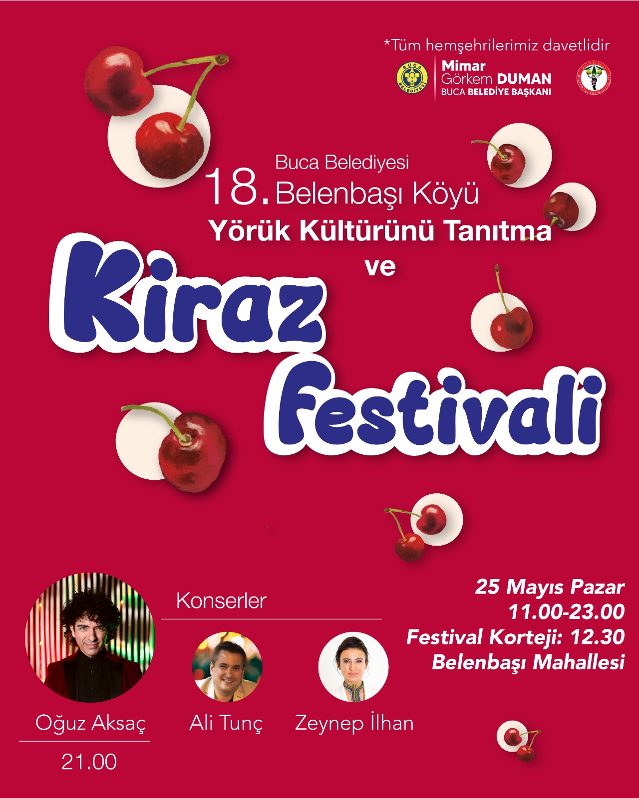 Buca Belediye Başkanı Görkem Duman, tüm İzmirlileri festivale davet ederek, “Yörük Kültürünü Tanıtma ve Kiraz Festivali, bölgemiz için çok değerli bir etkinlik. Bu festival, bölge ekonomisine katkıda bulunmasının yanı sıra bir kültürün yaşatılması, tanınması ve gelecek nesillere taşınması açısından da anlamlı bir adım. Her şeyden önce güzel ilçemizdeki barış ve kardeşlik duygularının pekişmesine katkı sağlayacak bir gün yaşayacağız” şeklinde konuştu.