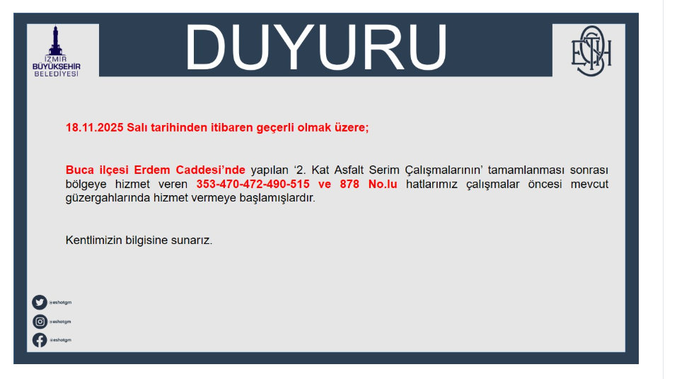 ESHOT açıklamasında şu ifadelere yer verildi: “18.11.2025 Salı tarihinden itibaren geçerli olmak üzere; Buca ilçesi Erdem Caddesi'nde yapılan '2. Kat Asfalt Serim Çalışmalarının' tamamlanması sonrası bölgeye hizmet veren 353, 470, 472, 490, 515 ve 878 No.lu hatlarımız, çalışmalar öncesi mevcut güzergahlarında hizmet vermeye başlamışlardır.”