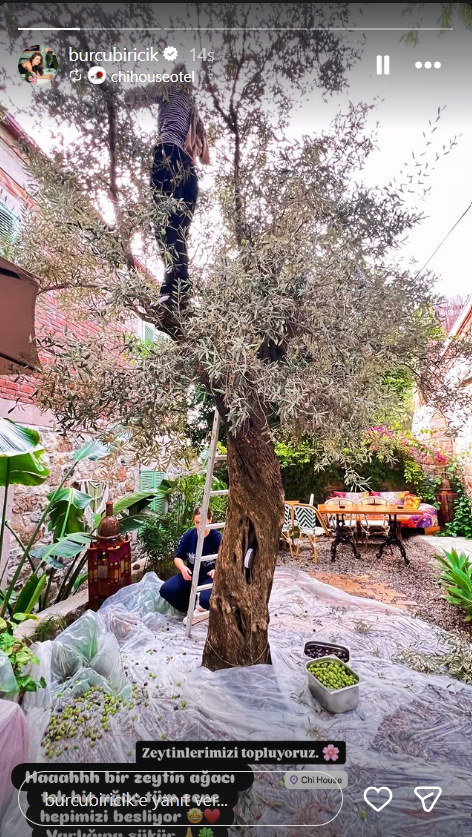 Ünlü oyuncu Burcu Biricik, otelinin bahçesindeki zeytin ağacına çıkarak zeytin topladı ve bu anları sosyal medya hesabında takipçileriyle paylaştı.