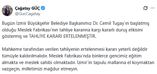 “Bugün İzmir Büyükşehir Belediye Başkanımız Dr. Cemil Tugay’ın başlatmış olduğu Meslek Fabrikası’nın tahliye kararına karşı kararlı duruş etkisini göstermiş ve tahliye kararı ertelenmiştir.” diyen Güç, yaptığı paylaşımda “Mahkeme tarafından verilen tahliyenin ertelenmesi kararı yeterli değildir tümüyle kaldırılmalıdır. Meslek Fabrikası’nda binlerce gencimiz eğitim almakta ve meslek sahibi olmaktadır. İzmir’in tapulu mallarına el koymaktan vazgeçin, milletimizi mağdur etmeyin.” ifadelerini kullandı.
