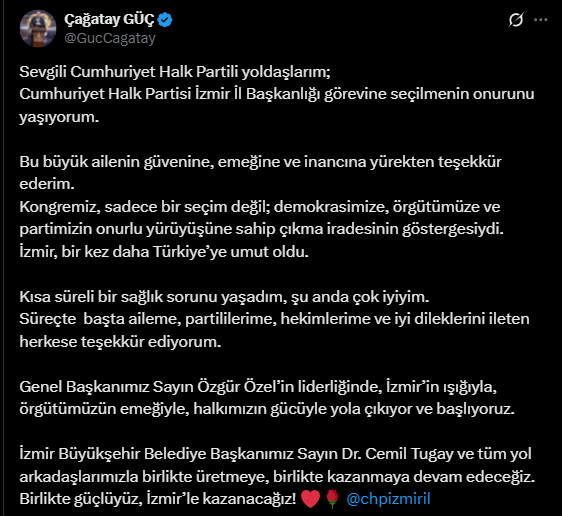 Şu anda çok iyiyim. Bu süreçte başta aileme, partililerime, hekimlerime ve iyi dileklerini ileten herkese teşekkür ediyorum. Genel Başkanımız Sayın Özgür Özel’in liderliğinde, İzmir’in ışığıyla, örgütümüzün emeğiyle, halkımızın gücüyle yola çıkıyor ve başlıyoruz. İzmir Büyükşehir Belediye Başkanımız Sayın Dr. Cemil Tugay ve tüm yol arkadaşlarımızla birlikte üretmeye, birlikte kazanmaya devam edeceğiz. Birlikte güçlüyüz, İzmir’le kazanacağız!”