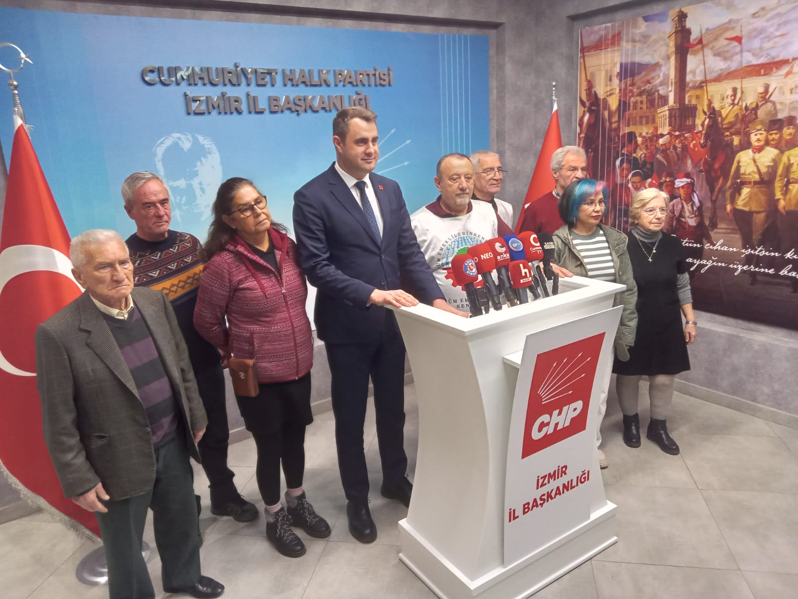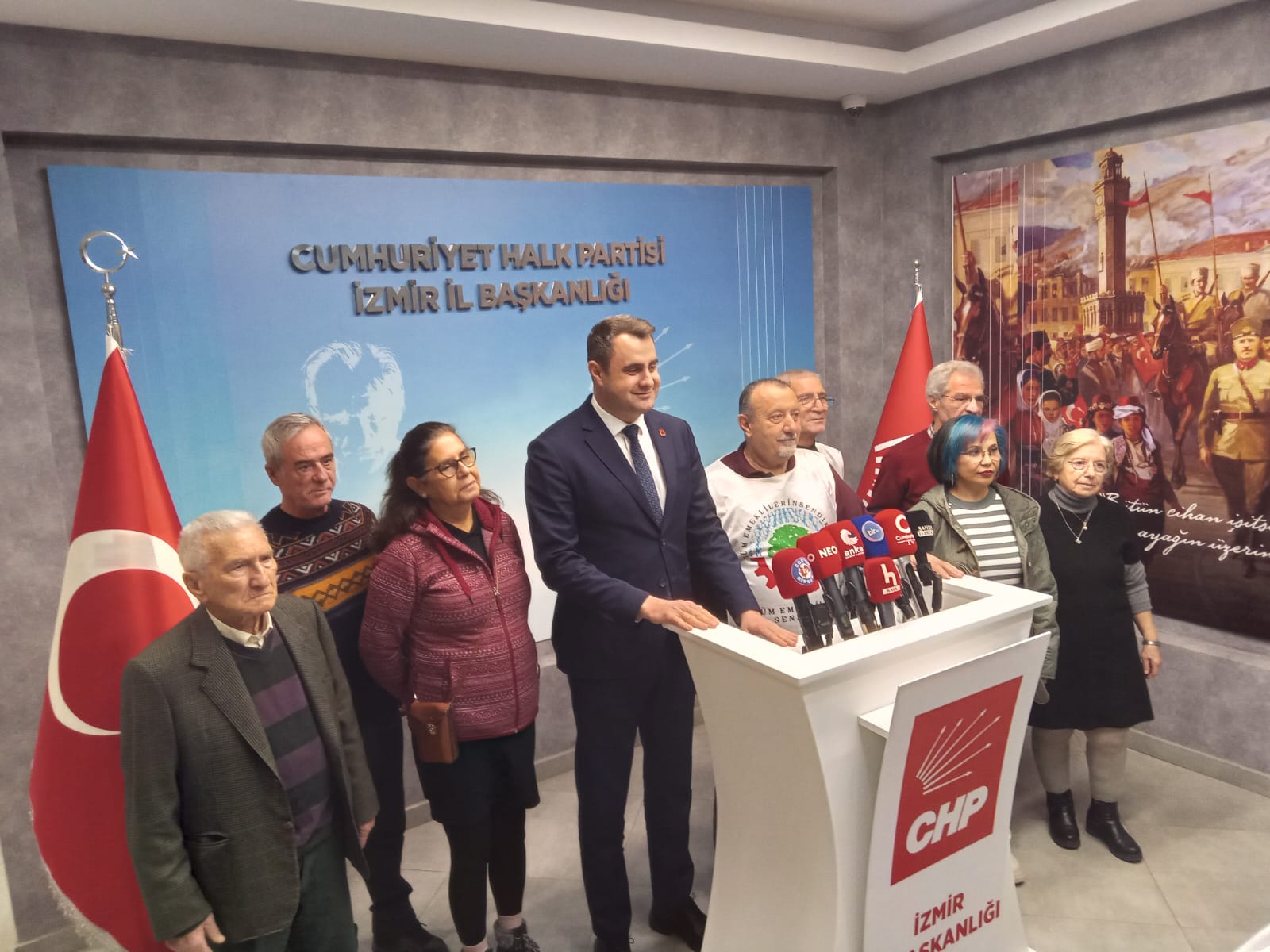 Tüm Emekliler Sendikası İzmir Şubeleri, Cumhuriyet Halk Partisi'nin (CHP) Meclis'te başlattığı emekli hakları eylemine destek amacıyla CHP İzmir İl Başkanı Çağatay Güç'ü ziyaret etti. CHP İzmir İl Başkanlığı'nda gerçekleşen ziyarette, emeklilerin yaşadığı ekonomik sorunlar ve artan yaşam maliyetleri konuşuldu.