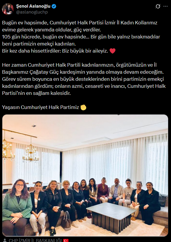 “Bugün ev hapsimdeyim, Cumhuriyet Halk Partisi İzmir İl Kadın Kolları evime gelerek yanımda oldular ve bana güç verdiler. 105 gün hücrede, bugün ev hapsindeyim… Partimizin emekçi kadınları beni bir gün bile yalnız bırakmadılar. Bir kez daha hissettirdiler: Biz büyük bir aileyiz.”