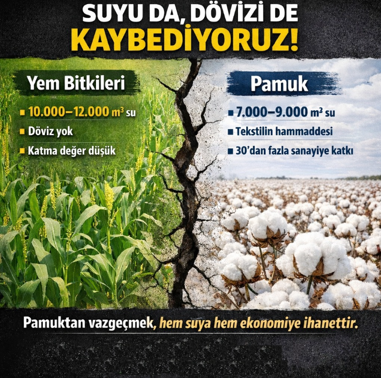 “Pamuktan yem bitkilerine geçiş, yalnızca bir ürün tercihi değil, su krizini derinleştiren, katma değeri düşüren ve ülkenin stratejik sektörlerini zayıflatan bir politikadır. Pamuk üretimini yeniden önceliklendirmek, çiftçinin sesine kulak vermek ve suyu akılcı yönetmek artık bir tercih değil, zorunluluktur.”