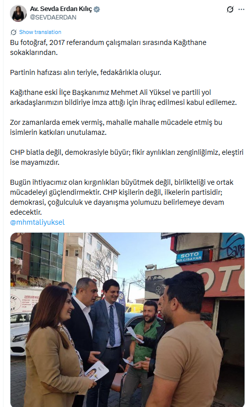 “Bu fotoğraf, 2017 referandum çalışmaları sırasında Kağıthane sokaklarından. Partinin hafızası alın teriyle, fedakârlıkla oluşur. Kağıthane eski İlçe Başkanımız Mehmet Ali Yüksel ve partili yol arkadaşlarımızın bildiriye imza attığı için ihraç edilmeleri kabul edilemez. Zor zamanlarda emek vermiş, mahalle mahalle mücadele etmiş bu isimlerin katkıları unutulamaz. CHP biatla değil, demokrasiyle büyür; fikir ayrılıkları zenginliğimiz, eleştiri ise mayamızdır. Bugün ihtiyacımız olan kırgınlıkları büyütmek değil, birlikteliği ve ortak mücadeleyi güçlendirmektir. CHP kişilerin değil, ilkelerin partisidir; demokrasi, çoğulculuk ve dayanışma yolumuzu belirlemeye devam edecektir.”