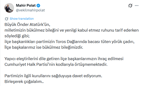 Büyük Önder Atatürk’ün, milletimizin bükülmez bileğini ve yenilgi kabul etmez ruhunu tarif ederken söylediği gibi; ilçe başkanlıkları partimizin Toros Dağlarında bacası tüten yörük çadırı, İlçe başkanlarımız ise bükülmez bileğimizdir. Yapıcı eleştirilerini dile getiren ilçe başkanlarımızın ihraç edilmesi Cumhuriyet Halk Partisi’nin kodlarıyla örtüşmemektedir. Partimizin ilgili kurullarını sağduyuya davet ediyorum. Birleşerek çoğalalım..