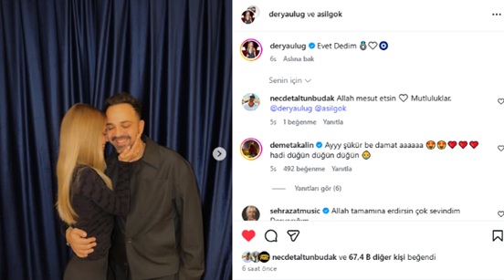 Şarkıcı Demet Akalın, Derya Uluğ’un paylaştığı fotoğraflarının altına “Ayyy şükür be damat aaaaaa, hadi düğün düğün düğün” yorumunu yaptı. Çiftin sevenlerinden sayısız kalpli emoji ve tebrik mesajları yağmaya başladı.