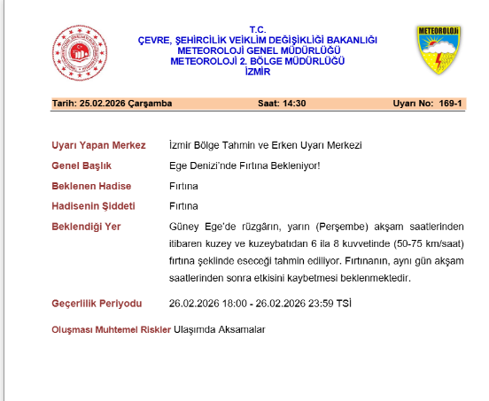 Meteoroloji 2’nci Bölge Müdürlüğü Tahmin ve Erken Uyarı Merkezi, 26 Şubat 2026 tarihinde saat 18:00 ile 23:59 arasında Ege Denizi'nin kuzeyinde fırtına olacağına dair bilgi verdi. Rüzgarın kuzey ve kuzeybatı yönlerinden saatte 50-75 kilometre hızla eseceği öngörülüyor. Fırtınanın akşam saatlerinde etkisini kaybetmesi bekleniyor.