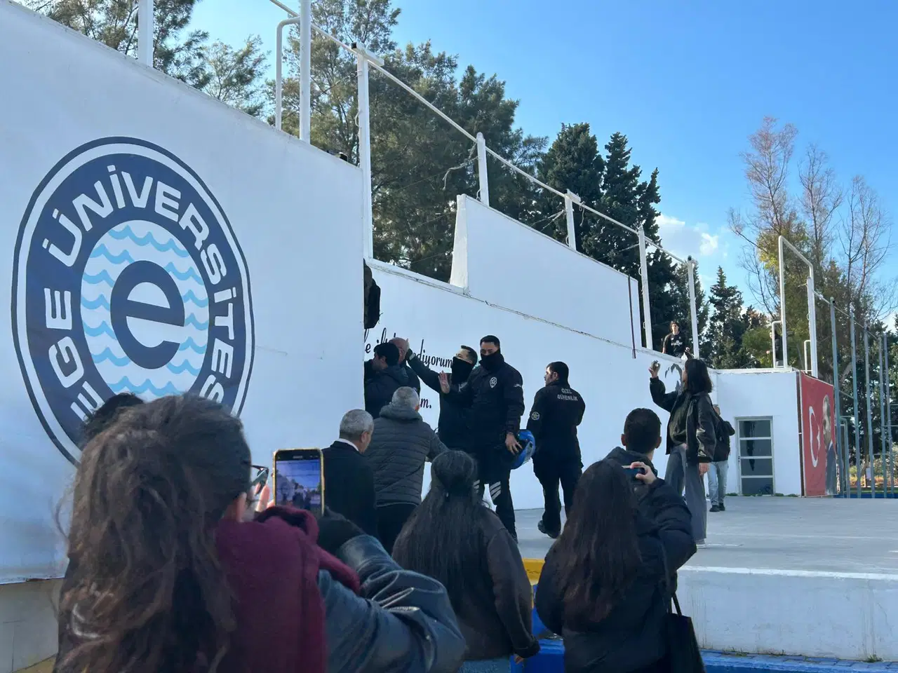Özel güvenlik, “Yobaz kayyım gidecek! Üniversiteler özgürleşecek” ve “Tarikata barikat kahrolsun şeriat” yazılı pankartlar asmak isteyen öğrencilere engel oldu.