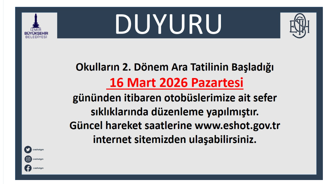 “Okulların 2. Dönem Ara Tatilinin Başladığı 16 Mart 2026 Pazartesi gününden itibaren otobüslerimize ait sefer sıklıklarında düzenleme yapılmıştır. Güncel hareket saatlerine www.eshot.gov.tr internet sitemizden ulaşabilirsiniz.”
