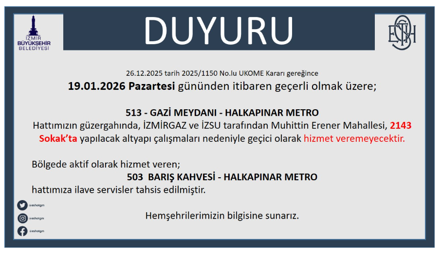 503 Barış Kahvesi – Halkapınar Metro hattı, bu çalışmalar süresince 2179 Sokak, İzmir Çevre Yolu ve Yüzbaşı İbrahim Hakkı Caddesi güzergahında gidiş ve dönüş seferleri yapacak. Ayrıca, Çardak, Dümbüllü, Kasap, Metaş İlköğretim Okulu, Köşe, Çeşme, Park, Çay Mahallesi Son Durak, Heykel, Şehit Hakan Uysal, Çorapçı, Dede Fırını, Bayraklı Çocuk Parkı ve Matbaa durakları geçici olarak iptal edilmiştir. ESHOT Genel Müdürlüğü, yaptığı açıklamada şu ifadeleri kullandı: “19.01.2026 Pazartesi gününden itibaren geçerli olmak üzere; Bayraklı 503 BARIŞ KAHVESİ – HALKAPINAR METRO hattımızın güzergahında, İZMİRGAZ ve İZSU tarafından Muhittin Erener Mahallesi, 2143 Sokak'ta yapılacak altyapı çalışmaları nedeniyle geçici olarak güzergah değişikliğine gidilmiştir. Hattımız 2179 Sokak, İzmir Çevre Yolu, Yüzbaşı İbrahim Hakkı Caddesi güzergahında gidiş ve dönüş olarak hizmet verecektir. Geçici olarak iptal olan duraklar: Çardak, Dümbüllü, Kasap, Metaş İlköğretim Okulu, Köşe, Çeşme, Park, Çay Mahallesi Son Durak, Heykel, Şehit Hakan Uysal, Çorapçı, Dede Fırını, Bayraklı Çocuk Parkı, Matbaa.”