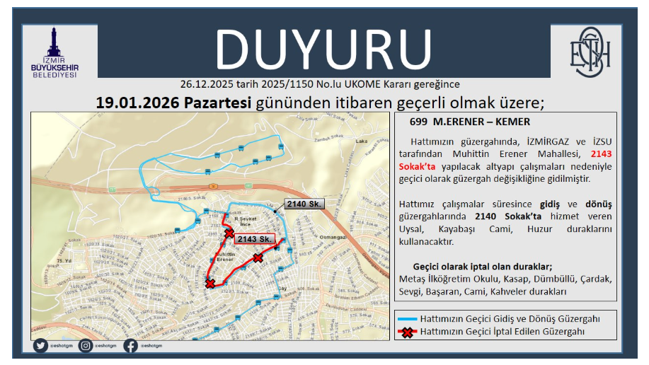 Duyuruda, altyapı çalışmaları nedeniyle 699 M.ERENER- KEMER hattının gidiş ve dönüş güzergahlarında 2140 Sokak üzerindeki Uysal, Kayabaşı Cami ve Huzur duraklarının kullanılacağı bildirildi. Böylece, Metaş İlköğretim Okulu, Kasap, Dümbüllü, Çardak, Sevgi, Başaran, Cami ve Kahveler durakları geçici olarak hizmet dışı kalacak. ESHOT Genel Müdürlüğü tarafından yapılan açıklamada şu ifadelere yer verildi: “19.01.2026 Pazartesi gününden itibaren geçerli olmak üzere; hattımızın güzergahında, İZMİRGAZ ve İZSU tarafından Muhittin Erener Mahallesi, 2143 Sokak'ta yapılacak altyapı çalışmaları nedeniyle geçici olarak güzergah değişikliğine gidilmiştir. Hattımız, çalışmalar süresince gidiş ve dönüş güzergahında 2140 Sokak’ta hizmet verecek olan Uysal, Kayabaşı Cami, Huzur duraklarını kullanacaktır. Geçici olarak iptal olan duraklar: Metaş İlköğretim Okulu, Kasap, Dümbüllü, Çardak, Sevgi, Başaran, Cami, Kahveler.