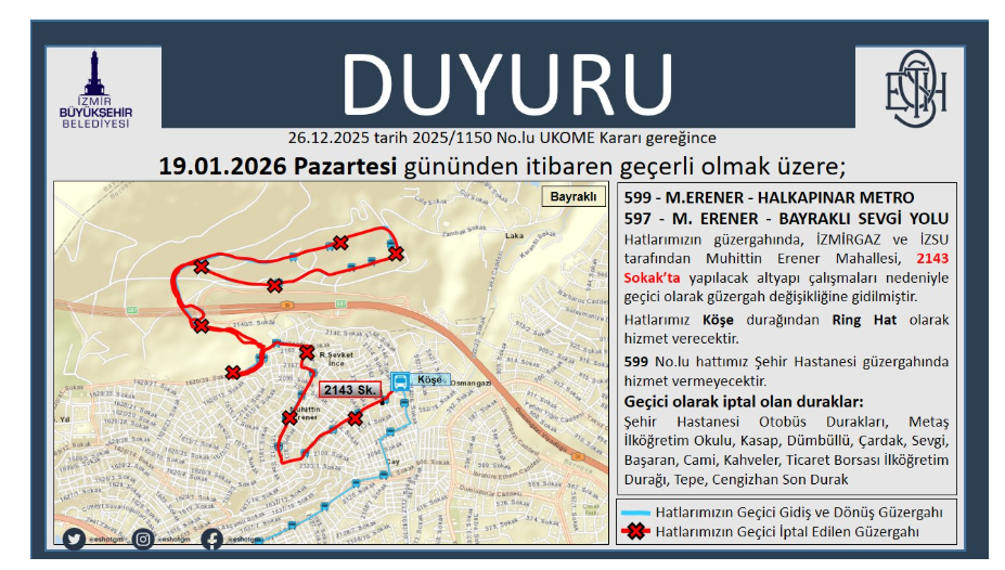 ESHOT Genel Müdürlüğü tarafından gerçekleştirilen açıklamada şu ifadelere yer verildi: “19.01.2026 Pazartesi gününden itibaren geçerli olmak üzere; 599-M.ERENER – HALKAPINAR METRO ve 597 – M. ERENER – BAYRAKLI SEVGİ YOLU hatlarımızın güzergahında, İZMİRGAZ ve İZSU tarafından Muhittin Erener Mahallesi, 2143 Sokak'ta yapılacak altyapı çalışmaları nedeniyle geçici olarak güzergah değişikliğine gidilmiştir. Hatlarımız Köşe durağından Ring Hat olarak hizmet verecektir.