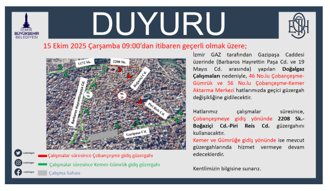 ESHOT Genel Müdürlüğü tarafından yapılan yazılı açıklamada şu ifadelere yer verildi: “15 Ekim 2025 Çarşamba 09:00'dan itibaren geçerli olmak üzere; 'İzmir GAZ tarafından Gazipaşa Caddesi üzerinde (Barbaros Hayrettin Paşa Cd. ile 19 Mayıs Cd. arasında) yapılan doğalgaz çalışmaları nedeniyle, 46 No.lu Çobançeşme-Gümrük ve 56 No.lu Çobançeşme-Kemer Aktarma Merkezi hatlarımızda geçici güzergah değişikliğine gidilecektir.
