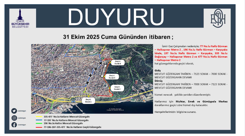 ESHOT tarafından yapılan açıklamada şu ifadelere yer verildi: “31 Ekim 2025 Cuma Gününden itibaren; İzmir Gaz Çalışmaları nedeniyle; 77 No.lu Nafiz Gürman – Halkapınar Metro 2, 196 No.lu Nafiz Gürman – Karşıyaka İskele, 197 No.lu Nafiz Gürman – Karşıyaka, 335 No.lu Doğançay – Halkapınar Metro 2 ve 477 No.lu Nafiz Gürman – Halkapınar Metro 2 hat güzergahlarında geçici olarak, Gidiş: MEVCUT GÜZERGAHI TAKİBEN – 7123 SOKAK – 7000 SOKAK – MEVCUT GÜZERGAHIN DEVAMI Dönüş: MEVCUT GÜZERGAHI TAKİBEN – 7000 SOKAK – 7123 SOKAK – MEVCUT GÜZERGAHIN DEVAMI hizmet verecek şekilde yeniden düzenlenmiştir. Hatlarımız için Muhtar, Emek ve Gümüşpala Merkez duraklarımız geçici süre hizmet dışı kalacaktır. Hemşehrilerimizin bilgisine sunarız.”