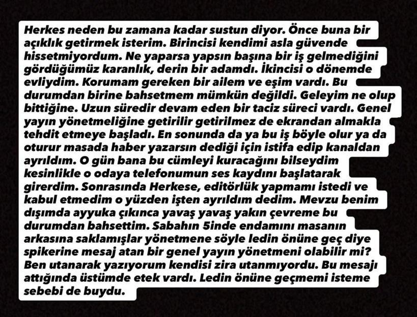 Köşker, sosyal medya üzerinden neden açıklama yapmadığını; “Kendimi asla güvende hissetmiyordum. O dönemde evliydim, ailemi korumam gerekiyordu.” sözleriyle açıkladı. “Uzun süren bir taciz süreci vardı. Genel yayın yönetmeni olarak tehdit edildiğimde istifa ettim. O gün bana bu cümleyi kuracağını bilseydim ses kaydını başlatarak girerdim.” dedi.