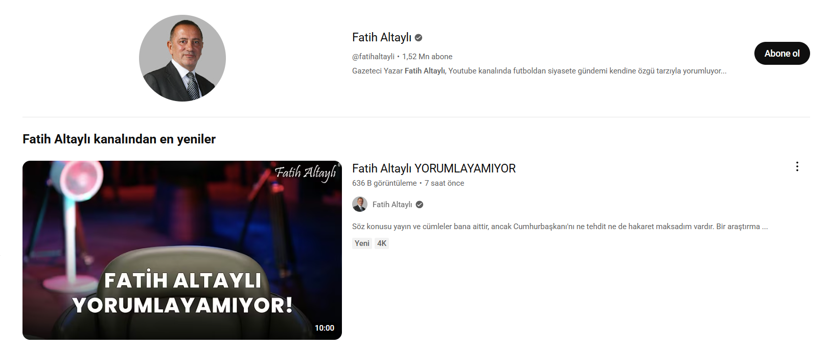 Gazeteci Fatih Altaylı, YouTube kanalında yaptığı bir açıklamanın ardından “Cumhurbaşkanını tehdit” suçlamasıyla tutuklandı. Altaylı’nın tutuklanması sonrası dikkat çeken başka bir durum ise, YouTube kanalında yansıtılan ve sadece boş bir koltuğu gösteren videonun kısa sürede yüz binlerce izlenme alması oldu. Video, 7 saat içerisinde 650 bine yakın izleyiciye ulaştı.