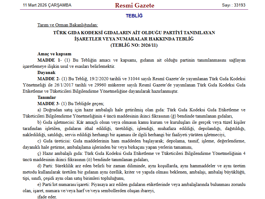 Gıdaların hangi üretim partisine ait olduğunu gösteren işaretlemelere ilişkin usul ve esaslar yeniden belirlendi. Tarım ve Orman Bakanlığı tarafından hazırlanan “Türk Gıda Kodeksi Gıdaların Ait Olduğu Partiyi Tanımlayan İşaretler veya Numaralar Hakkında Tebliğ” yayımlanarak yürürlüğe girdi.