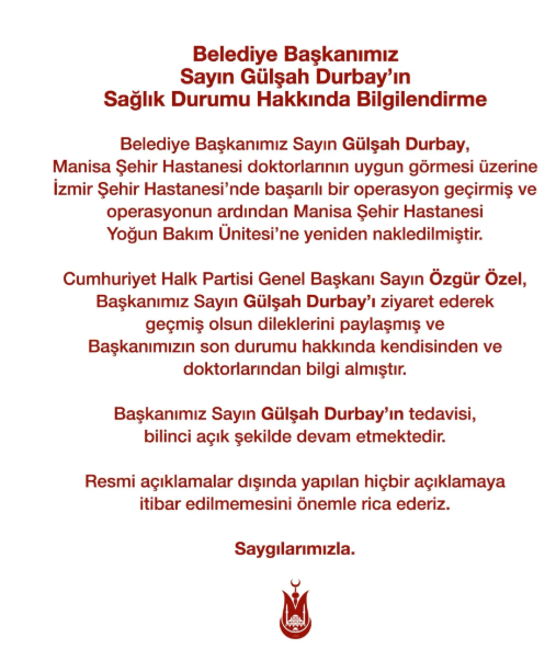 “Belediye Başkanımız Sayın Gülşah Durbay, Manisa Şehir Hastanesi doktorlarının uygun görmesi üzerine İzmir Şehir Hastanesi'nde başarılı bir operasyon geçirmiş ve operasyonun ardından Manisa Şehir Hastanesi Yoğun Bakım Ünitesi'ne yeniden nakledilmiştir.
