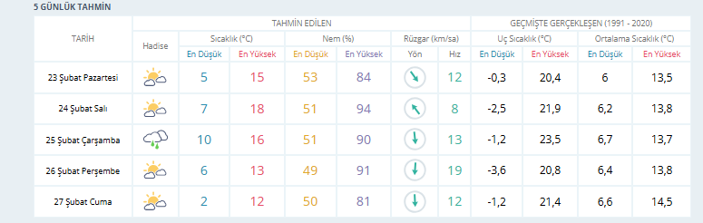 23 Şubat Pazartesi günü, İzmir’de hava genel olarak parçalı bulutlu olacak ve sıcaklık 15 derece civarında seyredecek. 24 Şubat Salı günü hava sıcaklığı 18 dereceye yükselecek ve bulutlu hava etkisini sürdürecek. 25 Şubat Çarşamba günü ise sağanak yağış bekleniyor, sıcaklık ise 16 derece etrafında kalacak. 26 ve 27 Şubat tarihlerinde hava yine parçalı bulutlu olacak, sıcaklıklar ise sırasıyla 13 ve 12 dereceye düşecek.