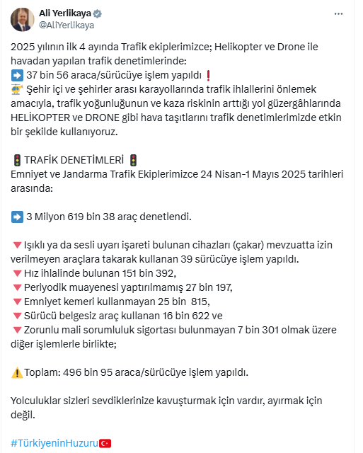 İçişleri Bakanı Ali Yerlikaya, sosyal medyada yaptığı paylaşımda, 2025 yılının Ocak-Nisan döneminde helikopter ve drone destekli denetimlerde toplam 37 bin 56 araç ve sürücüye işlem yapıldığını duyurdu. Denetimlerin, özellikle şehir içi ve şehirler arası yoğun ve riskli bölgelerde yoğunlaştırıldığı ifade edildi. Yerlikaya, açıklamasında “Trafik ihlallerini engellemek amacıyla, yoğunluk ve kaza riskinin yüksek olduğu yollarda helikopter ve drone gibi hava araçlarını etkin şekilde kullanıyoruz.” şeklinde konuştu.