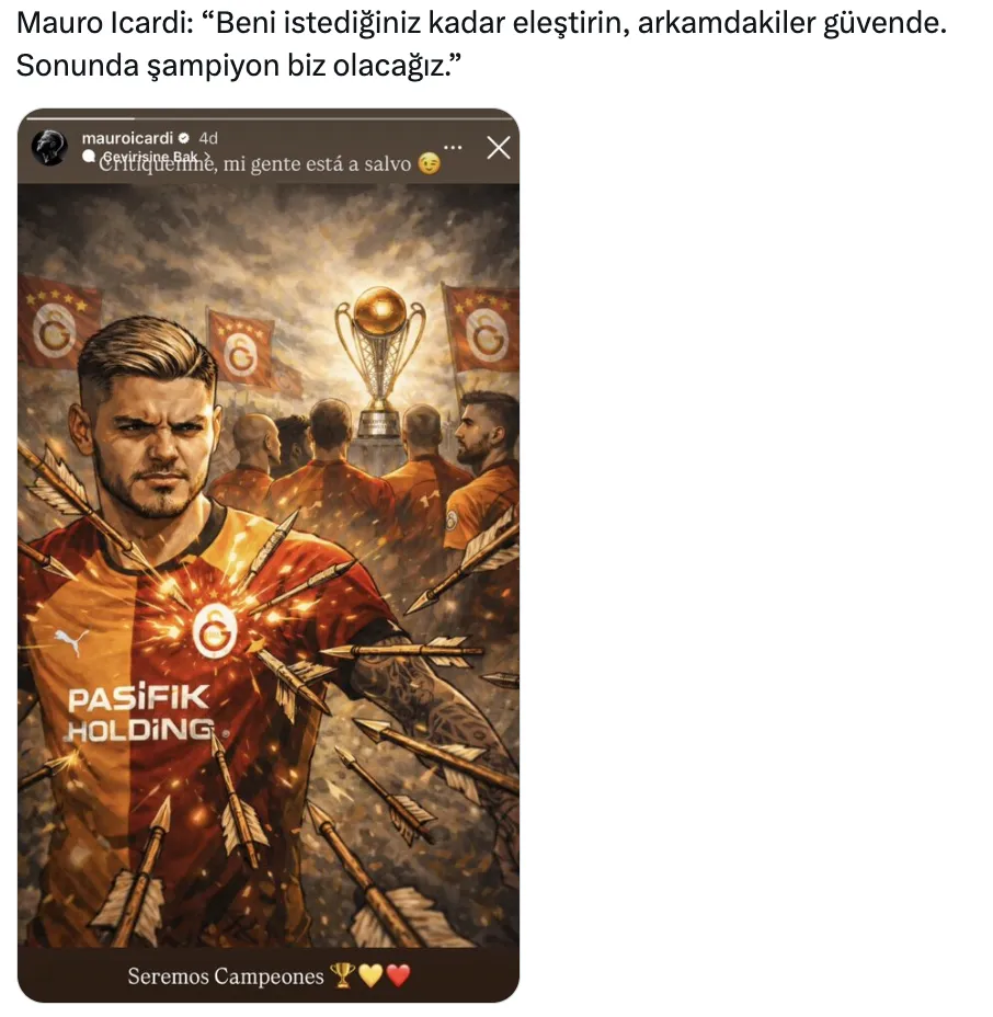 Icardi'nin paylaştığı görselde; takım arkadaşlarının şampiyonluk kupasına doğru yöneldiği, kendisinin ise en önde durarak Galatasaray'a atılan okları tek başına göğüslediği resmedildi. Icardi paylaşımda şu ifadeleri kullandı: