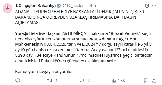 “Yüreğir Belediye Başkanı Demirçalı hakkında 'rüşvet vermek' suçu nedeniyle yürütülen soruşturma sonucunda, Adana 10. Ağır Ceza Mahkemesi'nin 3 Nisan 2026 tarih ve E:2024/17 sorgu sayılı kararı ile 5 yıl 3 ay 10 gün hapis cezası verilmesi üzerine, Anayasanın 127'nci maddesi ile 5393 sayılı Belediye Kanununun 47'nci maddesi uyarınca geçici bir tedbir olarak İçişleri Bakanlığı'nca görevden uzaklaştırılmıştır.”