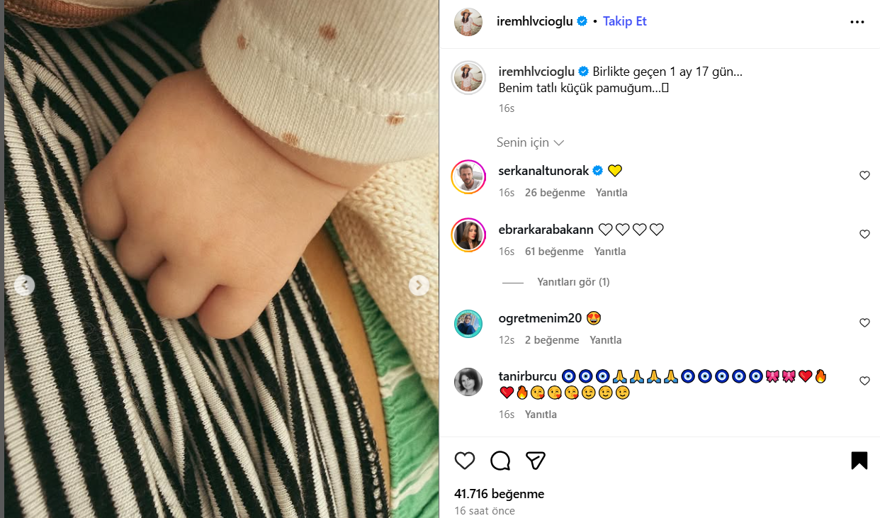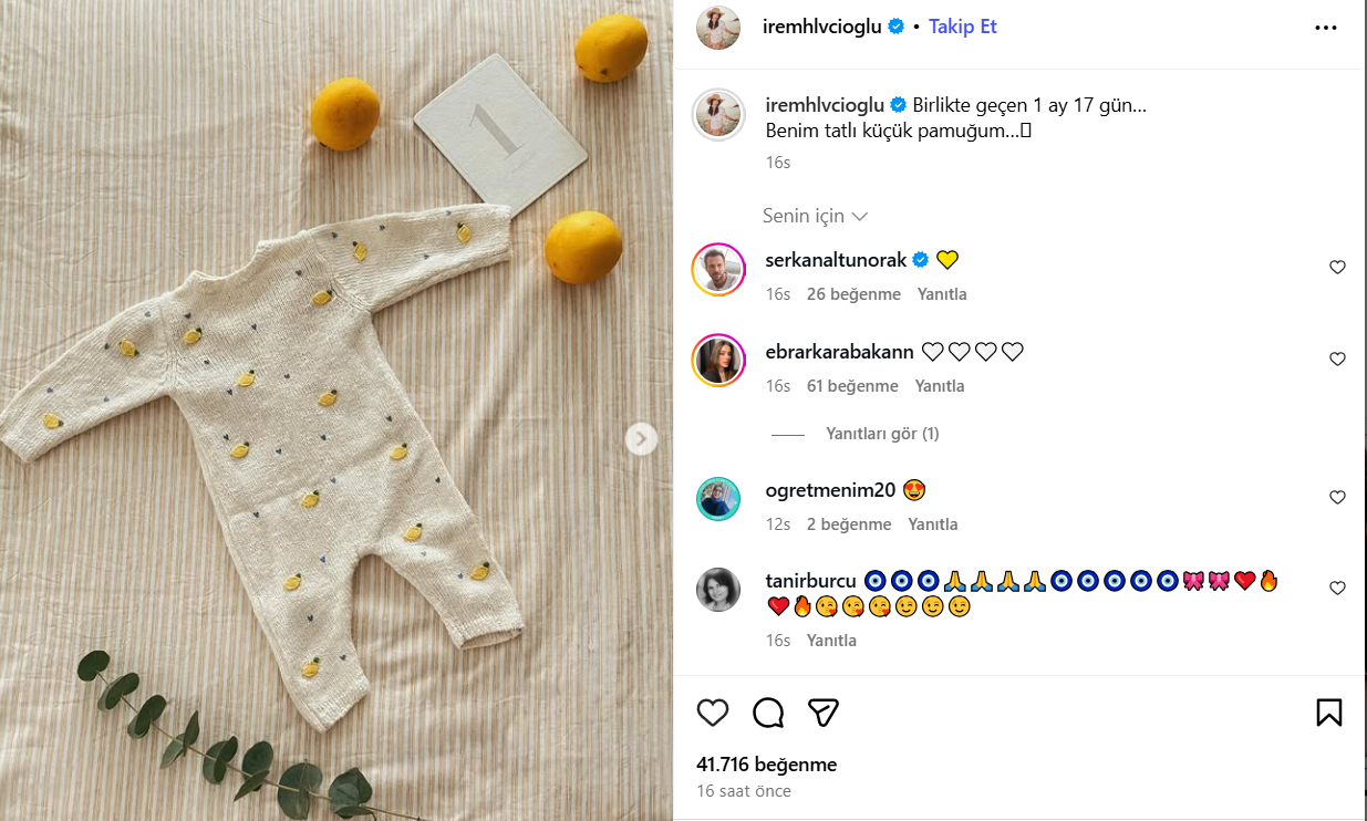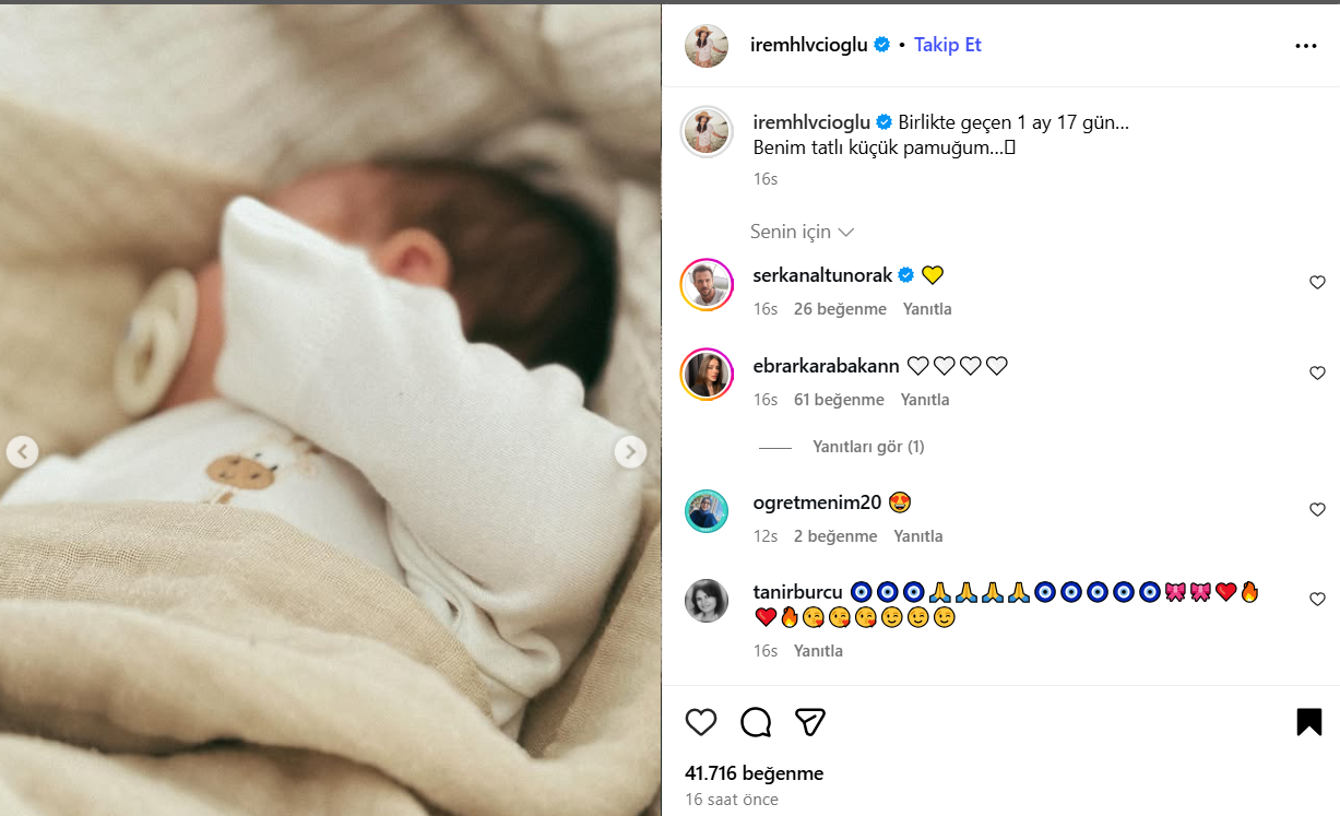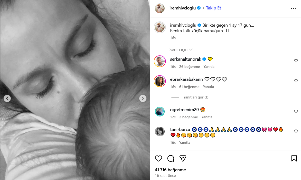 İrem Helvacıoğlu, Instagram'da yaptığı paylaşımda “Birlikte geçen 1 ay 17 gün… Benim tatlı küçük pamuğum…” diyerek duygularını ifade etti. Paylaşımı, takipçilerinden büyük ilgi gördü.