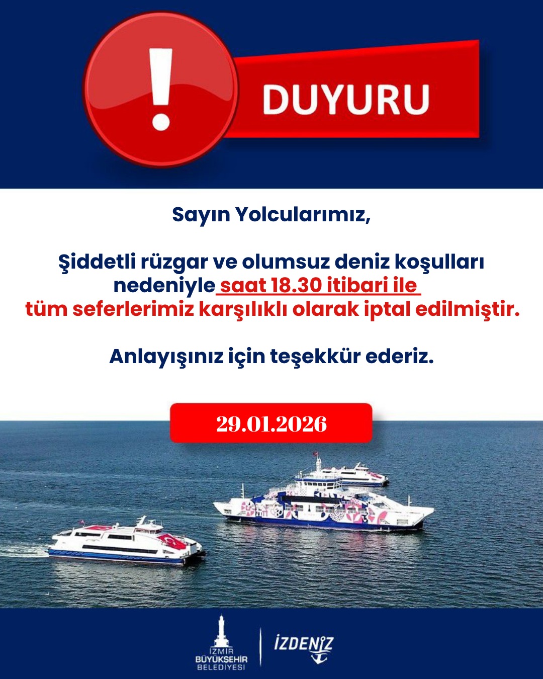 Yapılan açıklamaya göre, 29 Ocak 2026 Perşembe günü saat 18.30'dan itibaren tüm İZDENİZ seferleri çift yönlü olarak iptal edilmiştir. Genel Müdürlük, “Şiddetli rüzgâr ve olumsuz deniz koşulları nedeniyle saat 18.30’dan itibaren tüm seferlerimiz iptal edilmiştir. Anlayışınız için teşekkür ederiz.” şeklinde bir mesaj paylaştı.