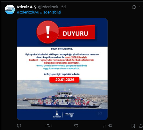Yapılan duyuruda, yolcu gemisi seferlerinin planlı bir şekilde devam edeceği ifade edildi. İZDENİZ'in açıklamasında şu ifadeler kullanıldı: “Sayın Yolcularımız, Üçkuyular İskelesi’ni etkileyen kuzeydoğu yönlü olumsuz hava ve deniz koşulları nedeniyle saat 13.10 itibarıyla Bostanlı – Üçkuyular hattındaki Arabalı Feribot seferlerimiz iptal edilmiştir. *Yolcu Gemisi seferlerimiz program dahilinde devam edecektir. Anlayışınız için teşekkür ederiz.”
