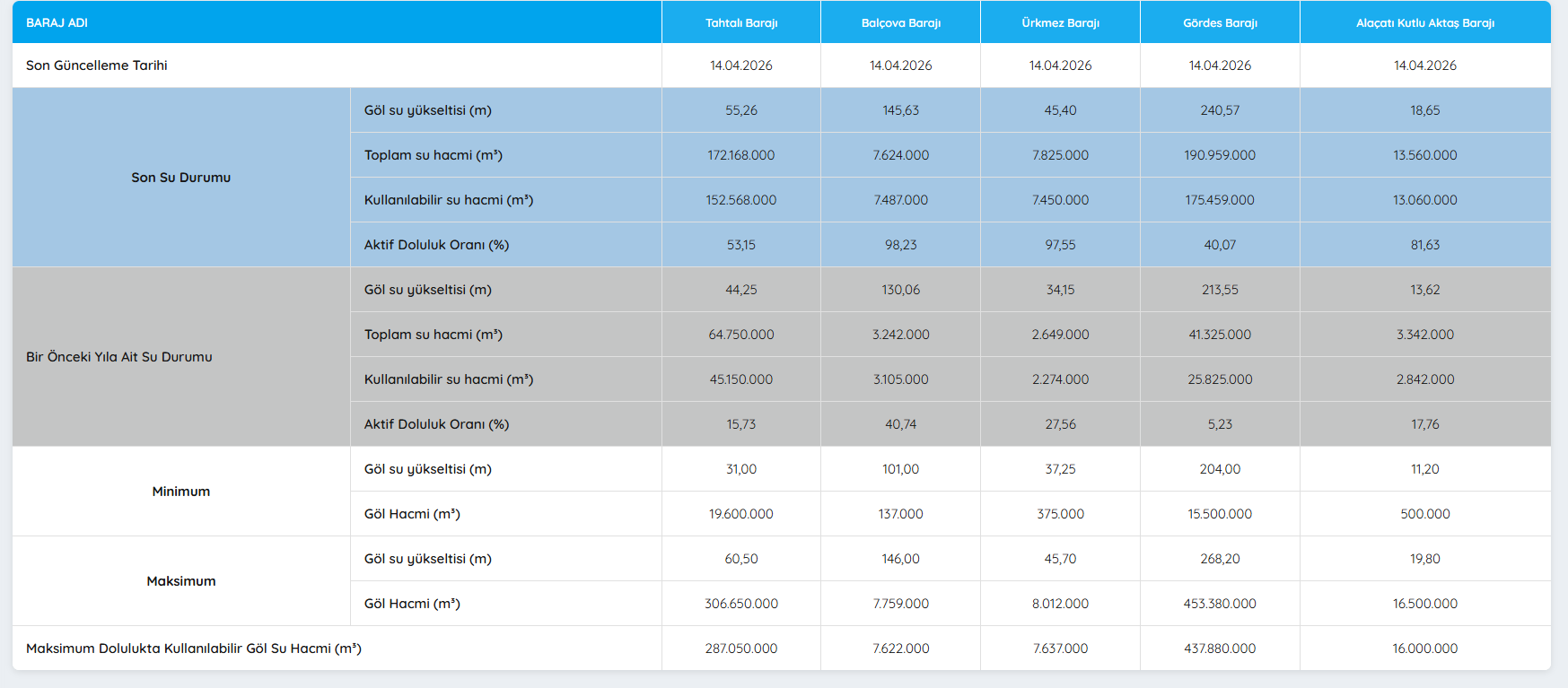 İzmir’de son haftalarda etkili olan yağışların ardından barajlardaki su seviyeleri yeniden gündemin üst sıralarına taşındı. İzmir Su ve Kanalizasyon İdaresi’nin (İZSU) 14 Nisan 2026 tarihli verileri, kent genelinde birçok barajda geçen yılın aynı dönemine göre belirgin artış yaşandığını ortaya koydu. Özellikle içme suyu kaynaklarında gözlenen yükseliş, su yönetimi açısından olumlu bir tabloya işaret etti. İşte İzmir'deki barajlarda güncel durum…