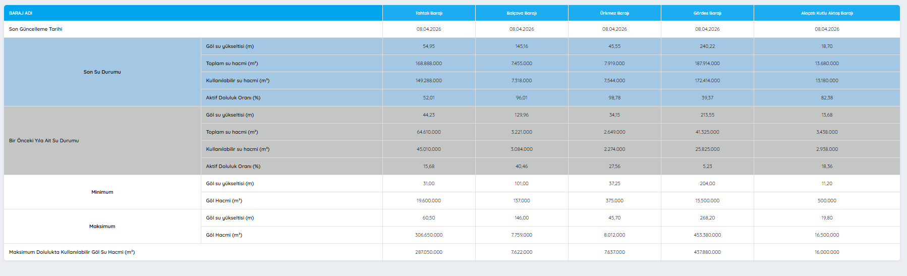 İzmir’de son günlerde etkili olan yağışların ardından baraj doluluk oranları yeniden gündeme geldi. İzmir Su ve Kanalizasyon İdaresi (İZSU), 8 Nisan 2026 tarihi itibarıyla İzmir'deki barajların güncel doluluk oranlarını paylaştı. İZSU tarafından açıklanan verilere göre birçok barajda geçen yılın aynı dönemine kıyasla belirgin artış yaşandı. İşte İzmir'deki barajlarda son durum…