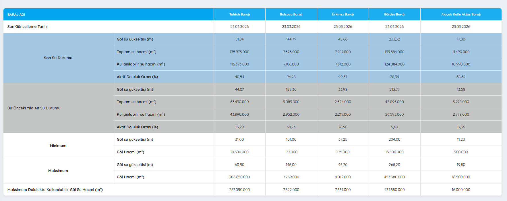 ALAÇATI KUTLU AKTAŞ BARAJI'NIN 23 MART 2026 DOLDULUK ORANI