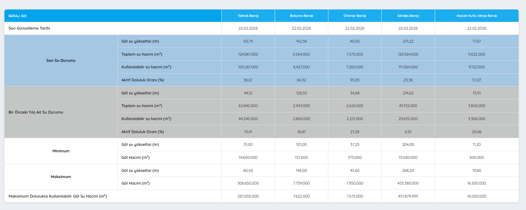 Son dönemde etkili olan sağanak yağışlar, İzmir’in içme suyu kaynaklarını olumlu yönde etkiledi. İzmir’i besleyen barajlara ait güncel bilgiler İZSU tarafından kamuoyuyla paylaşıldı. 22 Şubat 2026 tarihli ölçümlere göre birçok barajın doluluk oranının geçen yılın aynı dönemine kıyasla arttığı gözlemlendi.