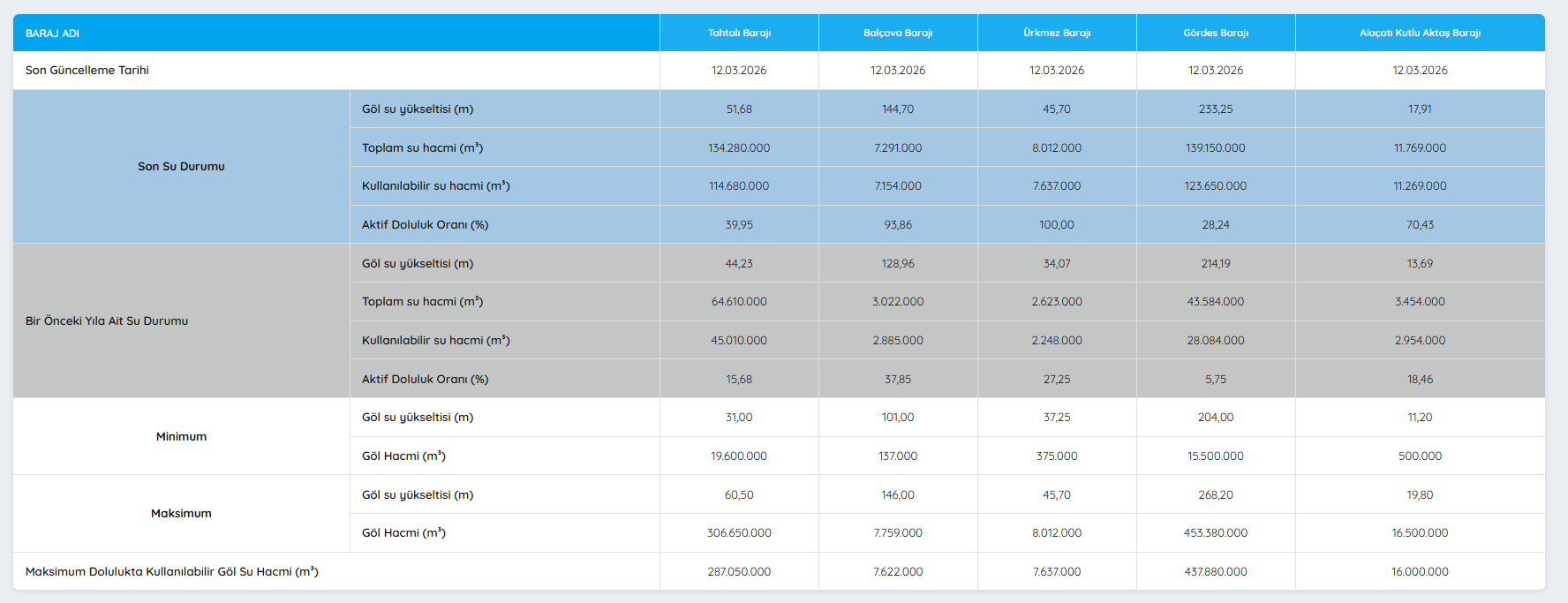 İzmir’de uzun süren kuraklık nedeniyle düşen baraj dolulukları geçtiğimiz haftalarda etkili olan yağışlarla yükseldi. İzmir Su ve Kanalizasyon İdaresi (İZSU), kentteki barajların güncel doluluk oranlarını kamuoyuyla paylaşıyor. 12 Mart 2026 tarihi itibariyle işte İzmir barajlarındaki güncel veriler…