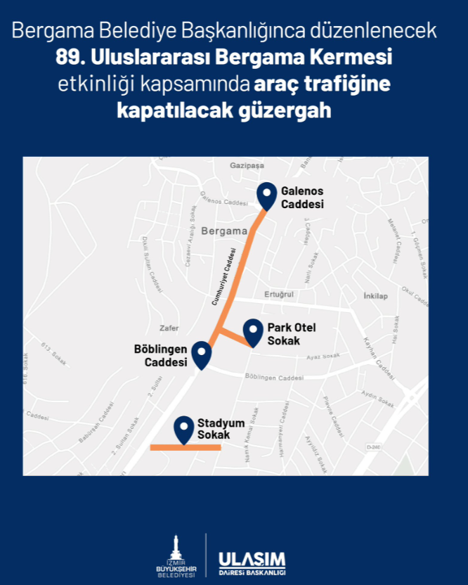 İzmir Büyükşehir Belediyesi, 89. Uluslararası Bergama Kermesi etkinlikleri nedeniyle Bergama’da bazı yolların geçici olarak trafiğe kapatılacağını duyurdu. Kapatma işlemleri 23 Haziran Pazartesi gününden itibaren başlayacak ve 29 Haziran Pazar gününe kadar devam edecek. Yola çıkacak olan İzmirlilerin bu güzergahlara dikkat etmeleri öneriliyor.