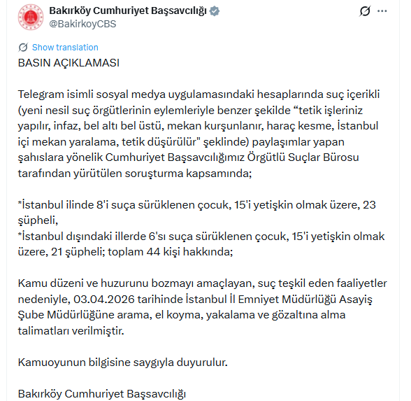 “Telegram isimli sosyal medya uygulamasındaki hesaplarında suç içerikli yeni nesil suç örgütlerinin eylemleriyle benzer şekilde 'tetik işleriniz yapılır, infaz, bel altı bel üstü, mekan kurşunlanır, haraç kesme, İstanbul içi mekan yaralama, tetik düşürülür' şeklinde paylaşımlar yapan şahıslara yönelik Cumhuriyet Başsavcılığımız Örgütlü Suçlar Bürosu tarafından yürütülen soruşturma kapsamında, İstanbul ilinde 8'i suça sürüklenen çocuk, 15'i yetişkin olmak üzere, 23 şüpheli, İstanbul dışındaki illerde 6'sı suça sürüklenen çocuk, 15'i yetişkin olmak üzere, 21 şüpheli, toplam 44 kişi hakkında kamu düzeni ve huzurunu bozmayı amaçlayan, suç teşkil eden faaliyetler nedeniyle, 3 Nisan'da İstanbul İl Emniyet Müdürlüğü Asayiş Şube Müdürlüğüne arama, el koyma, yakalama ve gözaltına alma talimatları verilmiştir.”