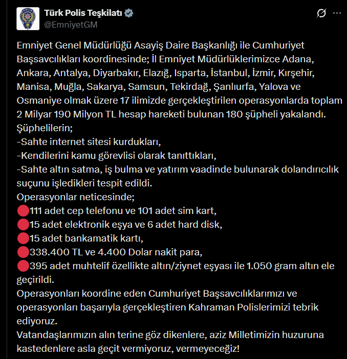 “Emniyet Genel Müdürlüğü Asayiş Daire Başkanlığı ile Cumhuriyet Başsavcılıkları koordinesinde; İl Emniyet Müdürlüklerimizce Adana, Ankara, Antalya, Diyarbakır, Elazığ, Isparta, İstanbul, İzmir, Kırşehir, Manisa, Muğla, Sakarya, Samsun, Tekirdağ, Şanlıurfa, Yalova ve Osmaniye olmak üzere 17 ilimizde gerçekleştirilen operasyonlarda toplam 2 Milyar 190 Milyon TL hesap hareketi bulunan 180 şüpheli yakalandı. Şüphelilerin; -Sahte internet sitesi kurdukları, -Kendilerini kamu görevlisi olarak tanıttıkları, -Sahte altın satma, iş bulma ve yatırım vaadinde bulunarak dolandırıcılık suçunu işledikleri tespit edildi. Operasyonlar neticesinde; 111 adet cep telefonu ve 101 adet sim kart, 15 adet elektronik eşya ve 6 adet hard disk, 15 adet bankamatik kartı, 338.400 TL ve 4.400 Dolar nakit para, 395 adet muhtelif özellikte altın/ziynet eşyası ile 1.050 gram altın ele geçirildi. Operasyonları koordine eden Cumhuriyet Başsavcılıklarımızı ve operasyonları başarıyla gerçekleştiren Kahraman Polislerimizi tebrik ediyoruz. Vatandaşlarımızın alın terine göz dikenlere, aziz Milletimizin huzuruna kastedenlere asla geçit vermiyoruz, vermeyeceğiz!”