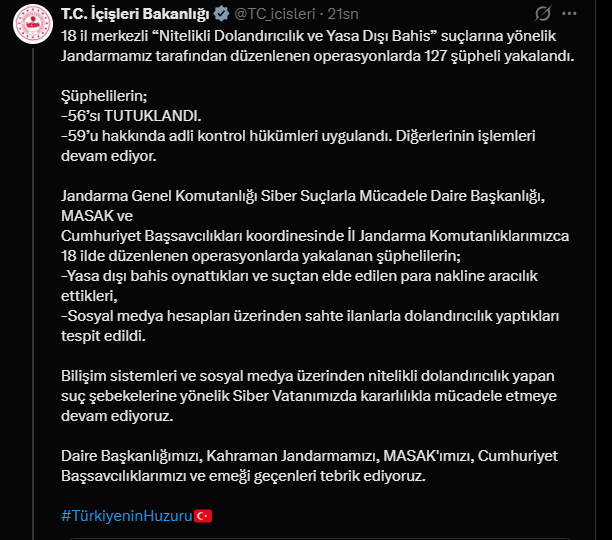 “18 il merkezli “Nitelikli Dolandırıcılık ve Yasa Dışı Bahis” suçlarına yönelik Jandarmamız tarafından düzenlenen operasyonlarda 127 şüpheli yakalandı. Şüphelilerin; -56’sı TUTUKLANDI. -59’u hakkında adli kontrol hükümleri uygulandı. Diğerlerinin işlemleri devam ediyor. Jandarma Genel Komutanlığı Siber Suçlarla Mücadele Daire Başkanlığı, MASAK ve Cumhuriyet Başsavcılıkları koordinesinde İl Jandarma Komutanlıklarımızca 18 ilde düzenlenen operasyonlarda yakalanan şüphelilerin; -Yasa dışı bahis oynattıkları ve suçtan elde edilen para nakline aracılık ettikleri, -Sosyal medya hesapları üzerinden sahte ilanlarla dolandırıcılık yaptıkları tespit edildi. Bilişim sistemleri ve sosyal medya üzerinden nitelikli dolandırıcılık yapan suç şebekelerine yönelik Siber Vatanımızda kararlılıkla mücadele etmeye devam ediyoruz. Daire Başkanlığımızı, Kahraman Jandarmamızı, MASAK'ımızı, Cumhuriyet Başsavcılıklarımızı ve emeği geçenleri tebrik ediyoruz.”